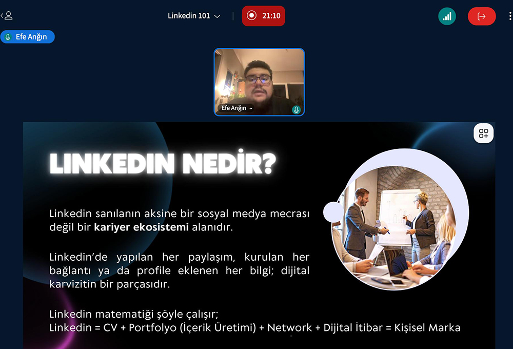 Eğitimin konuğu, Eğit. Etk. Planlama ve Org. Uzman Yardımcısı Mert Efe Anğın oldu. Anğın eğitimde, LinkedIn’in profesyonel ağ oluşturmadaki rolünü anlatarak öğrencilerin kariyer yolculuklarında nasıl güçlü bir dijital kimlik yaratabileceklerine dair değerli bilgiler paylaştı. Etkinlikte profil optimizasyonundan içerik üretim stratejilerine, işverenlerin dikkat ettiği noktalardan etkili bağlantı kurma tekniklerine kadar pek çok konu ele alındı.